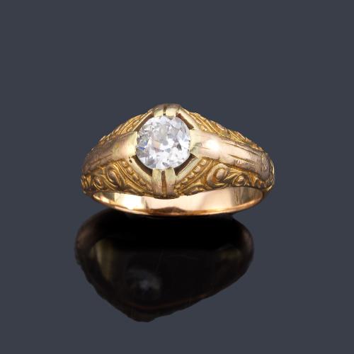 Anillo con diamante talla antigua de aprox. 0,60 ct en montura con motivos cincelados vegetales en oro amarillo de 18K.