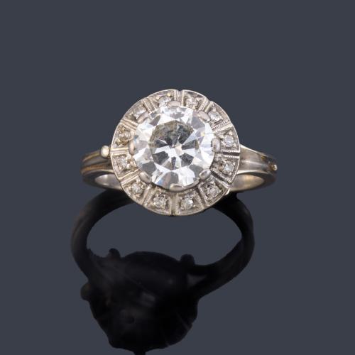 Solitario con brillante de aprox. 2,10 ct con orla de brillantes en montura de oro blanco de 18K.