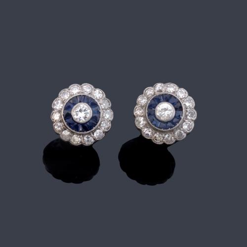 Presenta brillante central de aprox. 0,30 ct cada uno con doble orla de zafiros y brillantes. En montura de platino y cierre de presión.