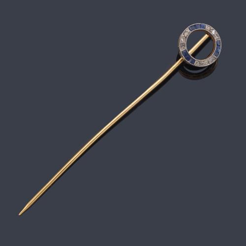 Alfiler con diseño circular con diamantes talla rosa y zafiros calibrados en montura de oro amarillo de 18K y vista en platino. Años '20.