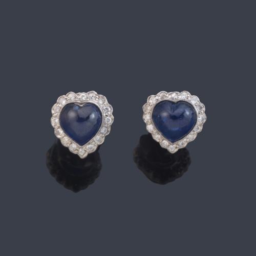 Pendientes cortos con pareja de zafiros en forma de corazón talla cabujón de aprox. 6,00 ct y orla de brillantes de aprox. 0,50 ct en total.