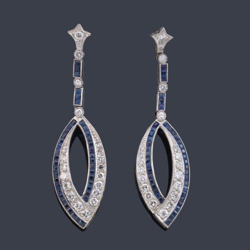 Pendientes largos con brillantes de aprox. 3,20 ct en total y zafiros calibrados de aprox. 2,50 ct.