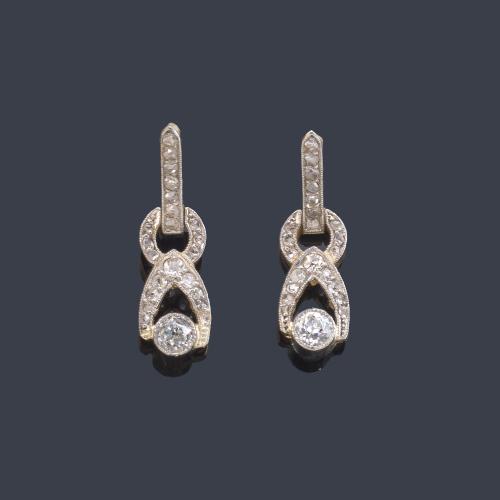 Pendientes largos con motivo de 'infinito' y remate de diamante talla antigua en engaste 'milligrain'. Años '30.