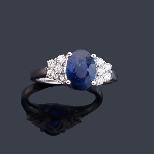 Anillo con zafiro talla oval de aprox. 1,50 ct con brillantes en ambos lados de aprox. 0,29 ct en total.