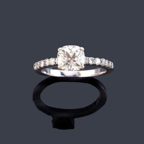 Solitario con diamante talla 'old cushion' de aprox. 2,10 ct con banda de brillantes en ambos lados.