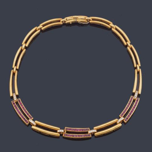 Collar corto con centro de eslabones con doble banda de rubíes calibrados con pasadores de diamantes.