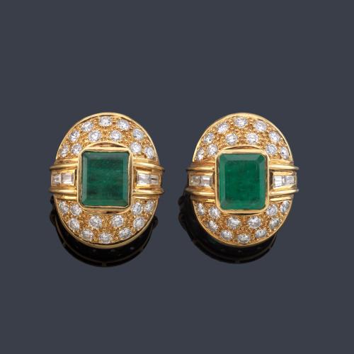 Pendientes cortos con pareja de esmeraldas de aprox. 9,00 ct en total y diamantes talla brillante y baguette de aprox. 2,40 ct en total.