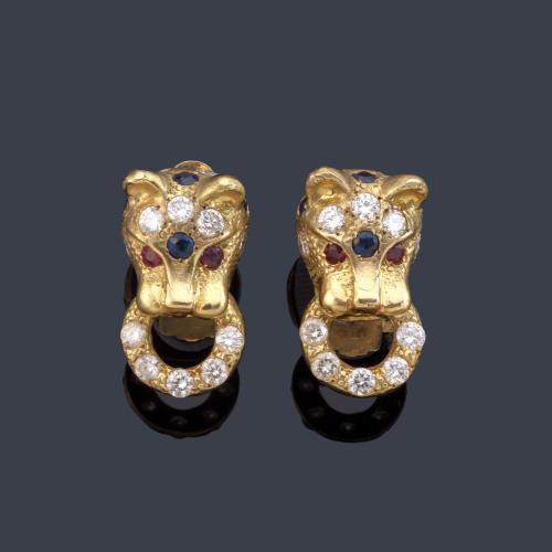 Pendientes cortos con doble cabeza de pantera con brillantes de aprox. 1,12 ct en total.