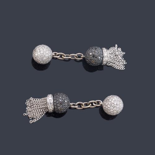Gemelos con doble motivo esférico cuajados de diamantes negros e incoloros en montura de oro blanco de 18K.