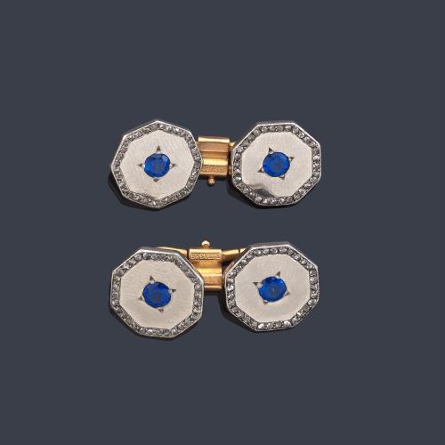 Gemelos 'Art Decó' con pareja de zafiros sintéticos con orla de diamantes talla rosa en montura de platino y oro amarillo de 18K. Años '30.