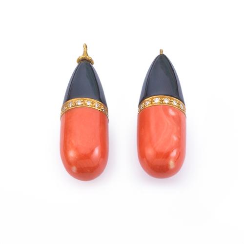 Pareja de perillas con ónix y coral con banda central de brillantes en montura de oro amarillo de 18K.