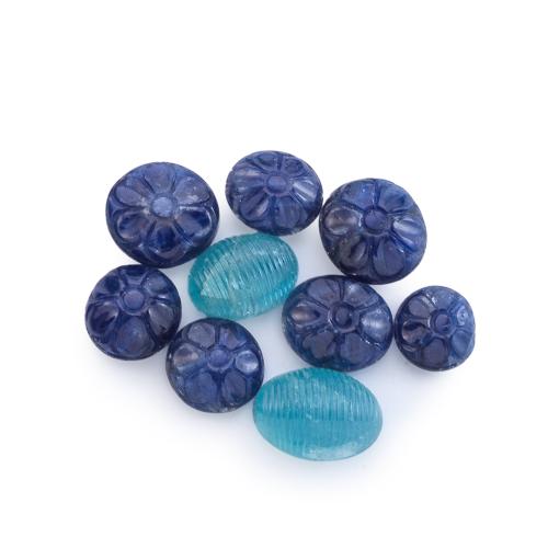 Lote compuesto por siete zafiros tallados con motivo de roseta de 129,81 ct y dos aguamarinas talla cabujón gallonados de aprox. 33,96 ct.