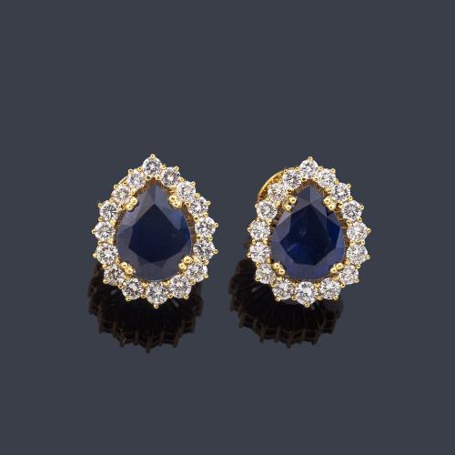 Pendientes cortos con pareja de zafiros talla perilla de aprox. 9,60 ct en total y orla de brillantes de aprox. 2,24 ct en total.