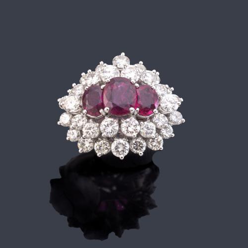 Anillo con tres rubíes talla oval de aprox. 2,70 ct con doble orla de brillantes de aprox. 3,88 ct en total.