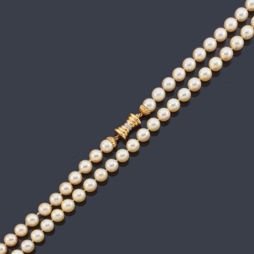 Collar largo con un hilo de perlas de aprox. 9,05 mm - 9,14 mm con cierre gallonado con centro de brillantes en montura de oro amarillo de 18K.