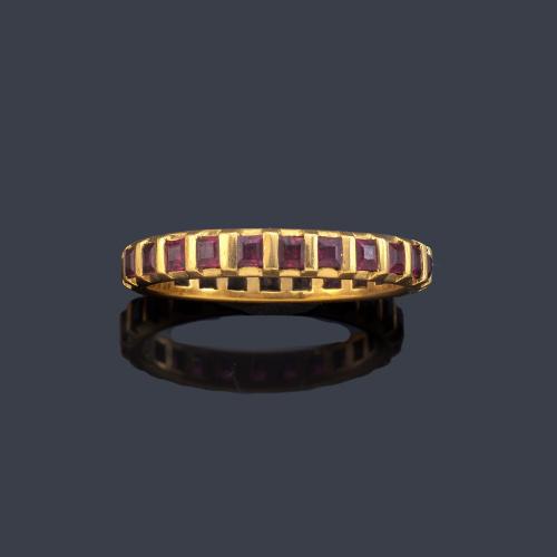 Alianza completa con rubíes calibrados en montura de oro de amarillo de 18K.