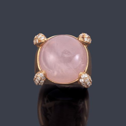 Anillo con cuarzo rosa talla cabujón con cuatro motivos de brillantes en montura de oro rosa de 18K.