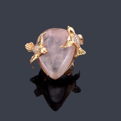 Anillo con gran cuarzo rosa talla perilla con dos motivos en ambos lados en forma de pajarillo con brillantes.