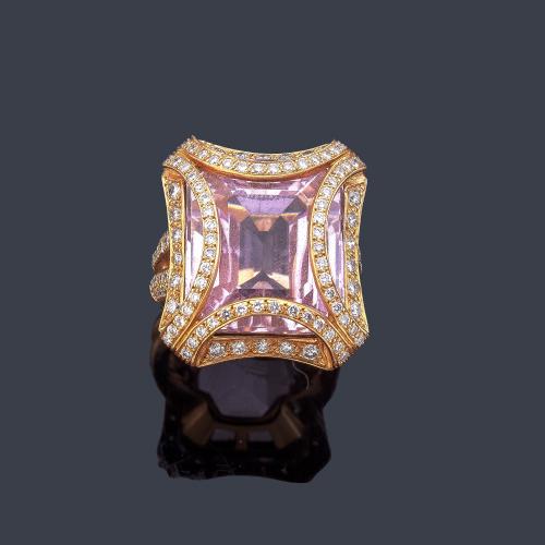 Anillo con kuncita rosa de aprox. 27,35 ct con orla de brillantes en montura de oro rosa de 18K.
