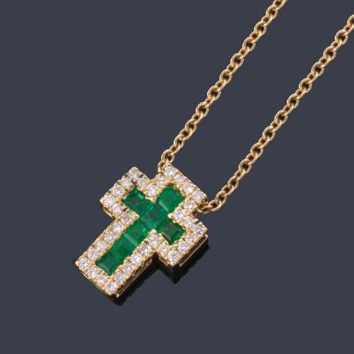 Cruz con esmeraldas calibrados de aprox. 0,20 ct y orla de brillantes de aprox. 0,09 ct en total.
