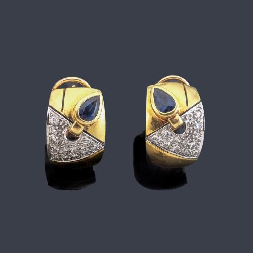 Lote 2420: Pendientes criolla con pareja de zafiros talla perilla de aprox. 0,40 ct cada uno y pavé de brillantes de aprox. 0,54 ct en total.