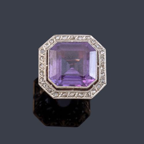 Anillo con amatista central de aprox. 14,30 ct con orla de diamantes talla rosa.