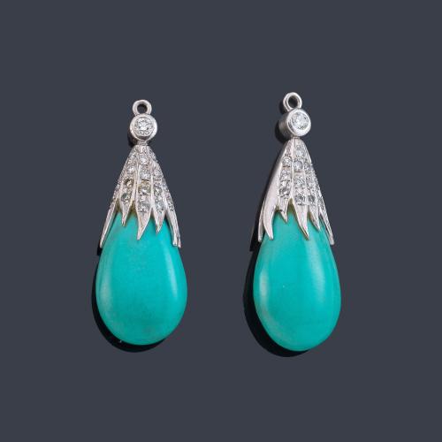 Doble remate para pendientes con pareja de chupones de turquesas con copete cuajado de brillantes.
