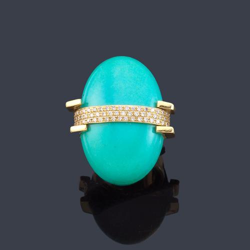 Anillo con gran turquesa talla cabujón y banda de pavé de brillantes en montura de oro amarillo de 18K.