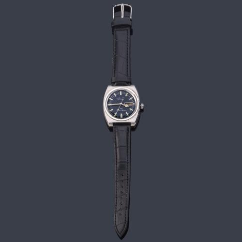 Esfera gris con numeración a trazos y agujas luminiscentes. Ventana auxiliar a las 3 para día de la semana y calendario fecha. Caja en acero. Pulsera en piel. Movimiento automático. Estado de marcha.