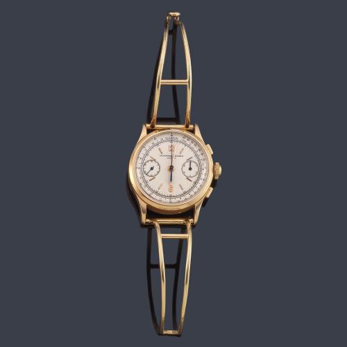 Esfera argente con numeración arábiga y trazos aplicados, agujas tipo bastón. Dos esferas auxiliares indican los segundos constantes y minutos cronográficos. Caja en oro rosa de 18 K. Pulsera en oro amarillo de 18 K (realizada por joyero). Mecanismo de cuerda. Estado de marcha.