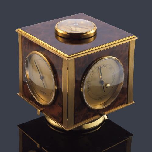 Reloj de cinco caras, cada una de las cuales representa una brújula, reloj, barómetro, higrómetro y termómetro. En latón dorado y lacado