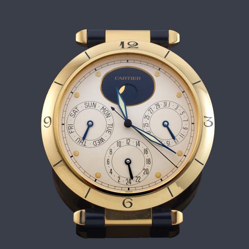 CARTIER Pasha Moon Phase, reloj de mesa en metal dorado y laca color azul.
