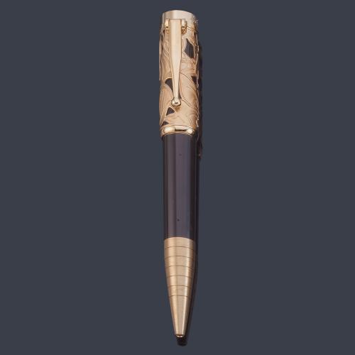 Cuerpo acabado en resina marrón, como una clara referencia a la madera, producto con el que estaba fabricado Pinocho. En el capuchón, acabado también en Resina Marrón, vemos unos apliques en relieve chapado en oro que representan la marioneta del personaje. Además, el clip alargado y acabado en una pequeña bola, simula la larga nariz de Pinocho cuando mentía. Perfecto estado de conservación. con estuche y documentación.