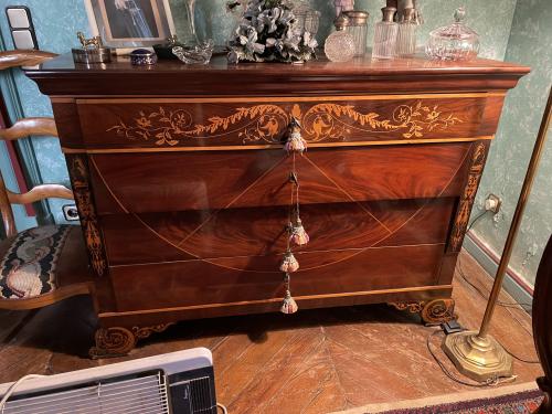 Cómoda fernandina en madera de caoba, palma de caoba y palosanto con detalles vegetales en limoncillo. Sobre patas recortadas. España, primer tercio del siglo XIX.