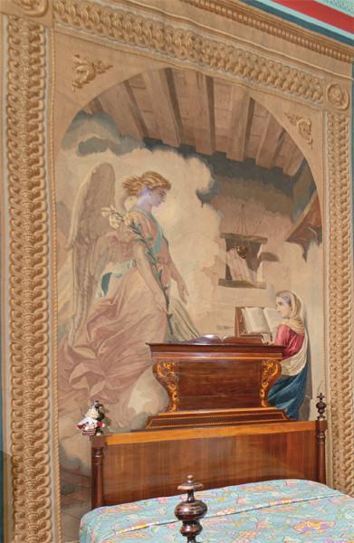 "La Anunciación", tapiz mecánico, firmado en el ángulo inferior izquierdo: MD 1877 Stuyk. Escena enmarcada bajo un arco triunfal y grecas.