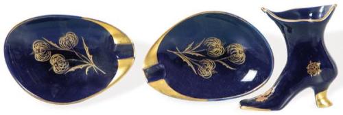 Lote 179: Conjunto de dos ceniceros y dos violeteros de Limoges Castel esmaltados en azul cobalto y decoración dorada. Siglo XX.