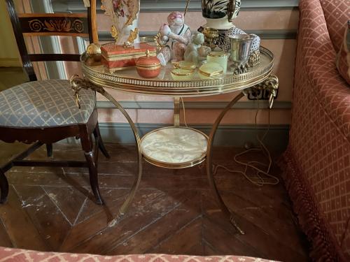 Pareja de mesas auxiliares redondas Maison Jansen con estructura de latón y pata cóncavas con cabezas y pezuñas de cabra. Tapa y balda de ónix. Francia, siglo XX.