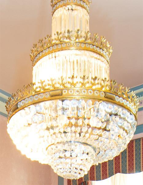 Lámpara de techo estilo Luix XVI con estructura en metal y latón con sartas y pandelocas de vidrio. Siglo XX.
