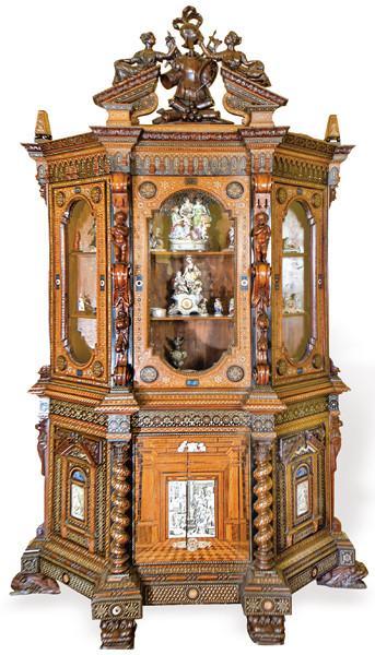 Cabinet estilo renacentista a la manera Certosina, en madera de nogal, profusamente decorado con incrustaciones de finos huesos que representan motivos florales y placas de lapislázuli. Cuerpo superior terminado en un entablamento moldurado y rematado por un frontón clásico partido. Dividido en tres escaparates acristalados. Se apoya en un aparador con puertas abatibles decorado con placas de hueso grabado inscritas dentro de arquitecturas clásicas en marquetería. Los grabados proceden de estampas anteriores de Lucas van Leyden y Marten der Vos.