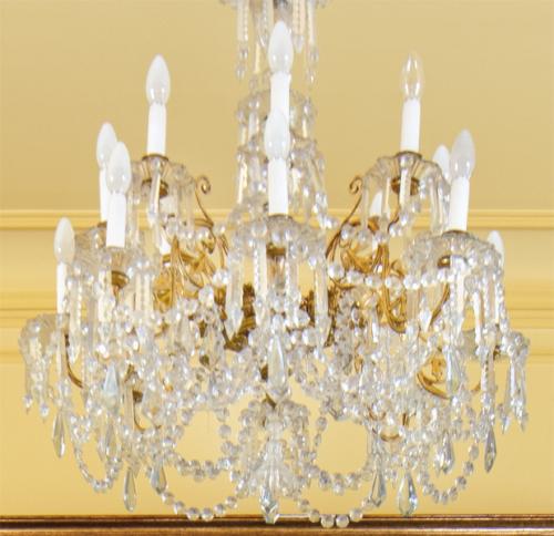 Lampara de ocho brazos de dos luces con estructura de latón, vidrio prensado, con sartas de y pandelocas. Siglo XX.