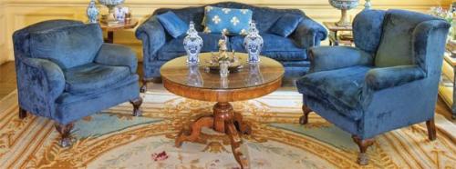 Lote 225: Dos sillones con patas en madera tallada en forma de garra de animal. Tapicería de chenilla azul. Siglo XX.