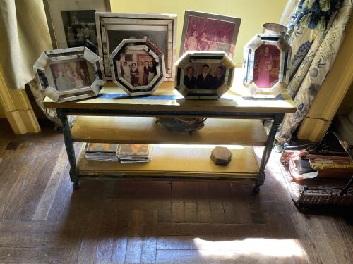 Mesa auxiliar rectangular en madera pintada en amarillo y marmoreado azul. Siglo XX.