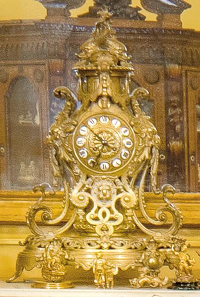 Lote 229: Reloj estilo Luis XV en forma de copa abalaustrada sobre plinto irregular recortado. Con mascarones a los lados, tornapuntas y hojas de acanto. Rematadao por peces entrelazados.