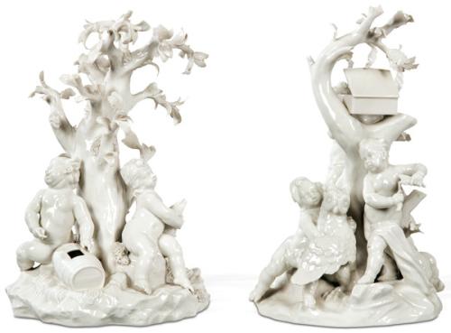Lote 282: Pareja de grupos escultoricos de niños jugando en porcelana esmaltada en blanco de Nymphenburg