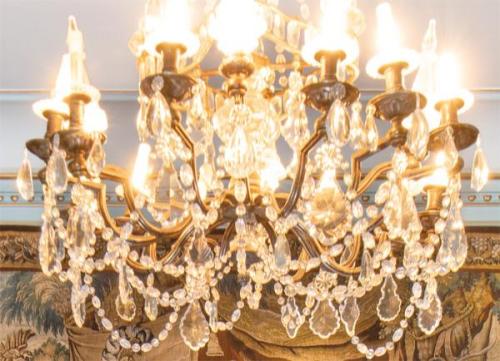 Lote 282-A: Lámpara de techo con 12 brazos de luz sobre estructura de bronce con sartas y pandelocas en vidrio prensado. Principios del siglo XX.