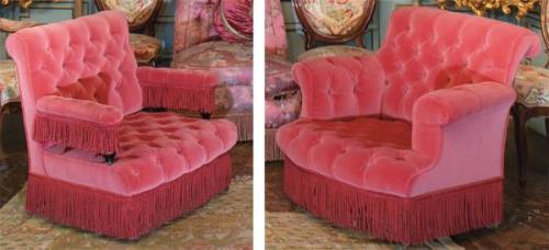 Lote 286: Pareja de butacas victorianas tapizadas en capitoné con tela de terciopelo rojo y flecos, sobre patas torneadas acabadas en ruedas. Inglaterra, segunda mitad del siglo XIX