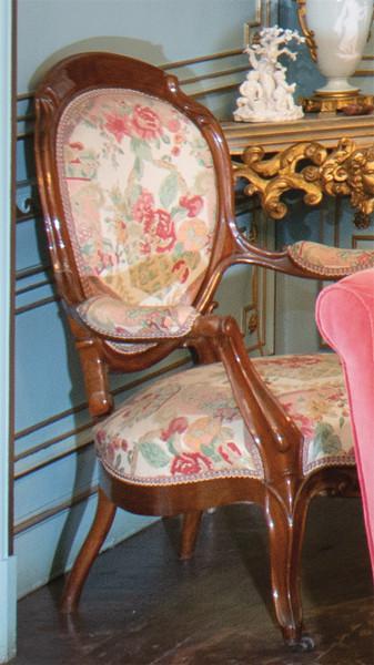 Lote 288: Conjunto de cuatro sillas isabelinas en madera de caoba tallada. Con tapicería de tela floral de época posterior. España, segunda mitad del siglo XIX.