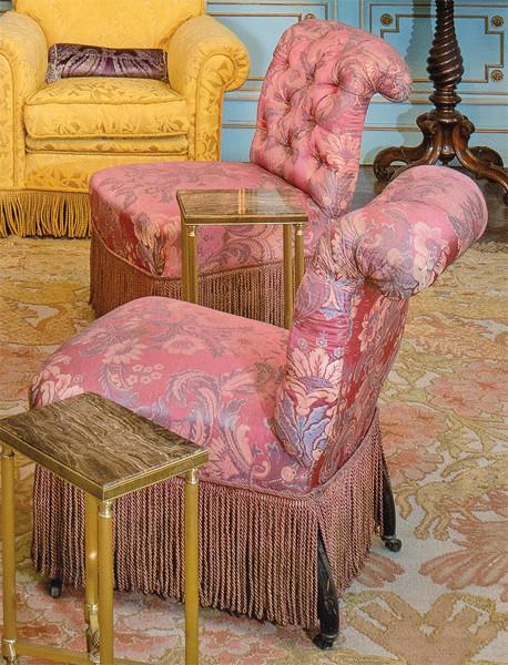 Lote 293: Pareja de butacas victorianas con respaldo capitoné y asiento en tela de seda adamascada y flecos. Inglaterra, segunda mitad del siglo XIX.