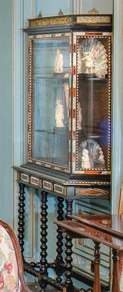 Escaparate estilo Carlos II en madera de nogal ebonizada. Con puerta abatible enmarcada por decoraciones en carey y hueso. Sobre bufete de patas denticulares unidas. España, segunda mitad del siglo XIX.
