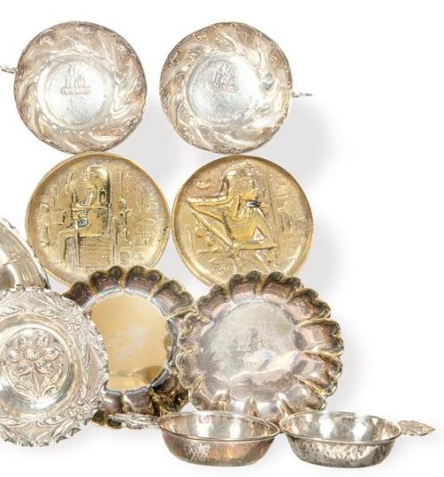 Lote formado por 4 bernegales de plata, dos platillos circulares de bronce con decoración egipcia y dos ceniceros de metal plateado con mitra papal y la fecha 1962